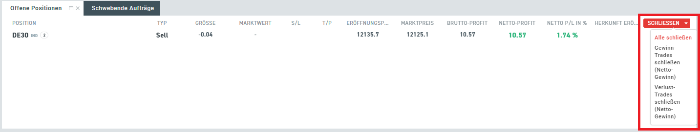 Mit einem Klick auf den Pfeil in der Schaltfläche "Schliessen" können Sie mit nur einem Klick alle vorhandenen Transaktionen auf einmal schließen. Zudem haben Sie hier auch zwei weitere Optionen: Alle Gewinn-Trades schließen, oder alle Verlust-Trades schließen. Mit dieser Funktion können Sie schnell und einfach Entscheidungen ausführen.