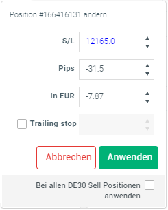 - Trailing Stop: Trailing Stop ein- oder ausschalten (nur nur für Stop-Loss Order möglich)