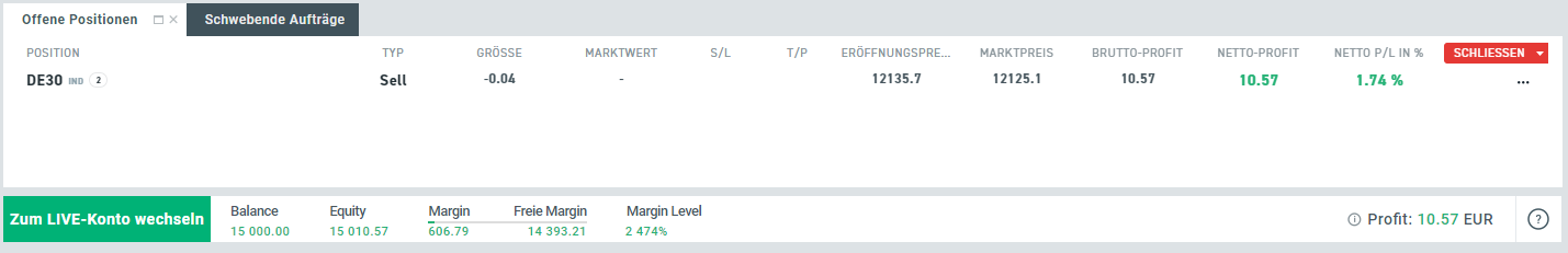 - Profit: Gewinn-/Verlust-Verrechnung (auch P/L genannt) aller offenen Positionen