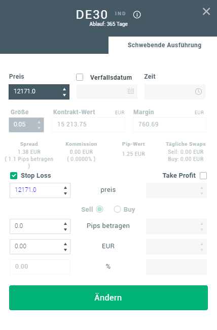 In dieser Ansicht können Sie alle Informationen zu Ihren vorhandenen schwebenden Aufträgen einsehen. Um einen schwebenden Auftrag zu bearbeiten, führen Sie einen Doppelklick auf dem Auftrag aus oder wählen per Rechtsklick auf dem Auftrag die Option "Ändern" aus. Es öffnet sich ein Fenster zum Bearbeiten.