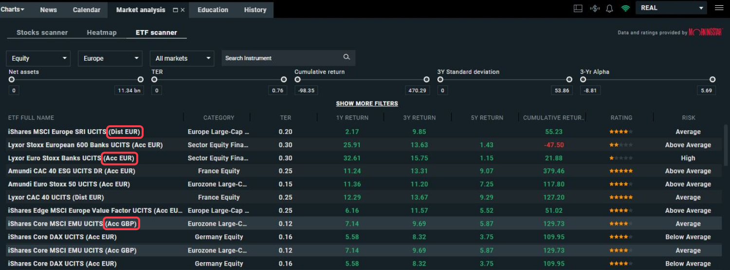 Our xStation platform has a built-in ETF scanner that allows filtering the ETF model so clients can easily find interesting dividend and accumulation ETFs (acronyms ‘Acc’ and ‘Dist’) and use advanced selection tools.