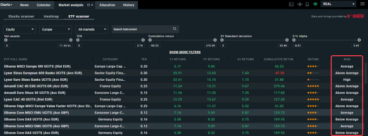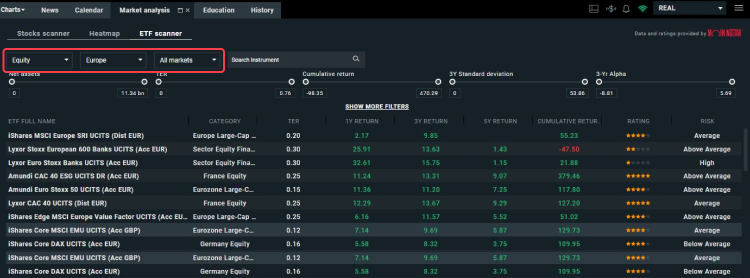 The ETF Scanner is a tool available in the xStation trading platform, under the 'Market Analysis' tab, and it allows you to efficiently search for ETFs using advanced filters.