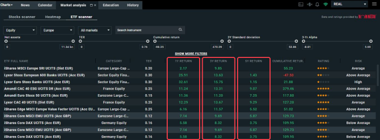 ETF xStation scanners have also advanced data available on a given ETF, such as information about its past return rates in Year to Year, 1 year, 3 years and even 5 years horizon. We also add Alpha and Beta ratios to the ETFs, which are used by many investors to calculate the profitability of their investments.