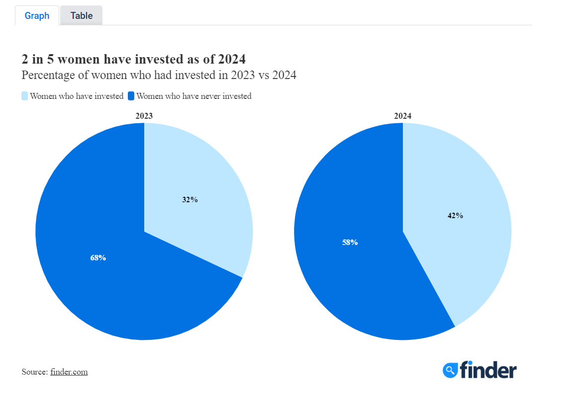 According to an analysis found by Finder: 2 in 5 women (42%) have invested before as of 2024, up from a third (32%) in 2023 - what do we think is contributing to this change?