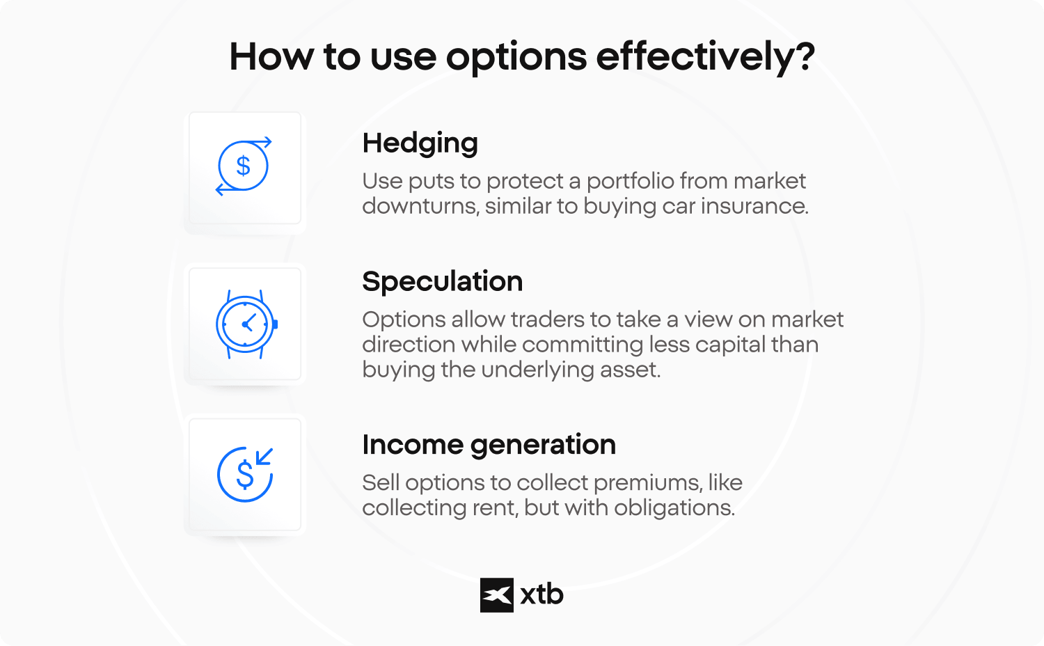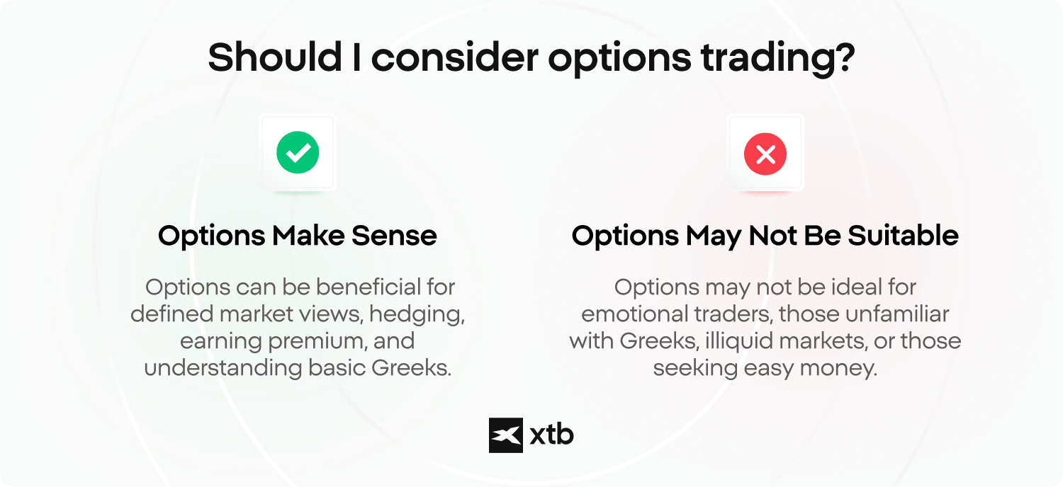 - Hedging and income: Options are not only speculative. They can protect a portfolio and generate premium under certain strategies.