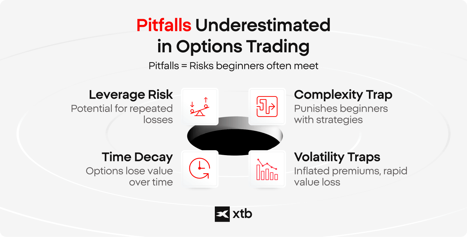 XTB infographic highlighting underestimated pitfalls in options trading, including leverage risk, time decay, complexity trap, and volatility traps that beginners commonly face.