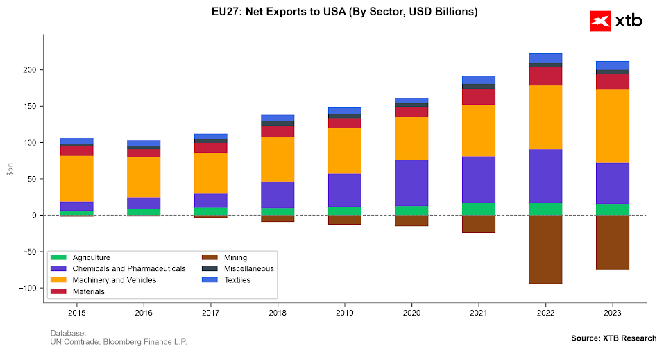Net exports to the United States from the EU in recent years. As can be seen, machinery and vehicles, followed by chemicals and pharmaceuticals, account for the largest share of exports. The EU is a net importer of raw materials from the USA. Source: Bloomberg Finance LP, XTB
