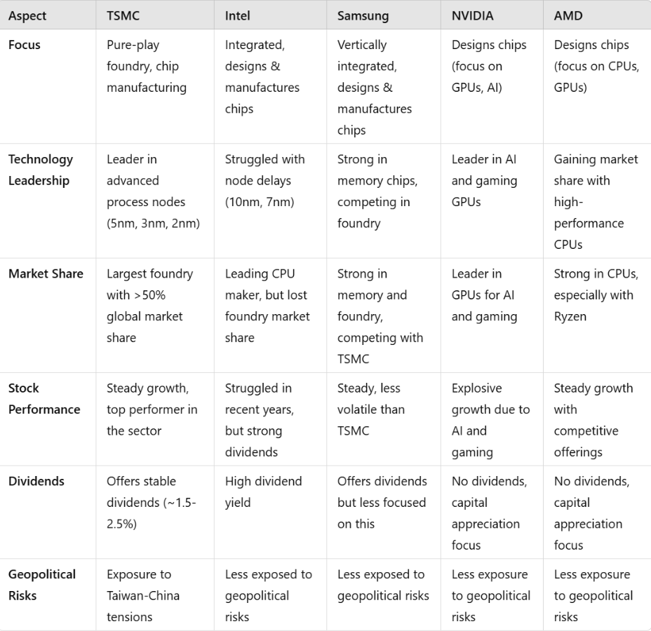 - While NVIDIA has seen explosive growth due to its role in AI and gaming chips, Intel has faced challenges in advancing to smaller nodes. Samsung competes in memory and foundry businesses but has a different focus than TSMC, which is solely a foundry.