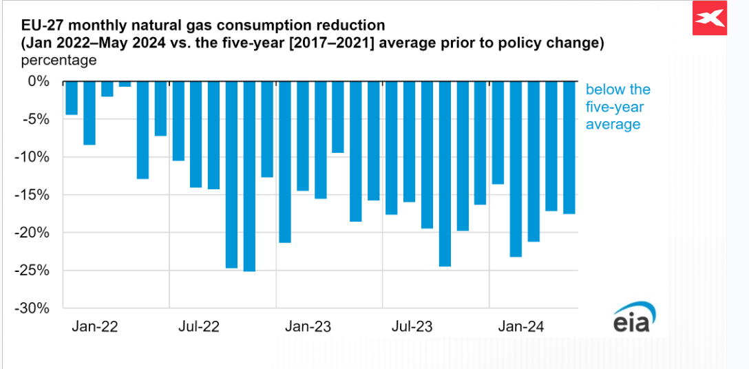 On the demand side, levels of demand in Europe are returning to normal after a spike post the Russian invasion of Ukraine in 2022. The EU’s monthly gas consumption is now below its 5-year average as you can see in the chart below. Supply has also shifted this year, with the US becoming the biggest LNG exporter in the world. However, with demand dwindling, US exports may well slow in the coming months.