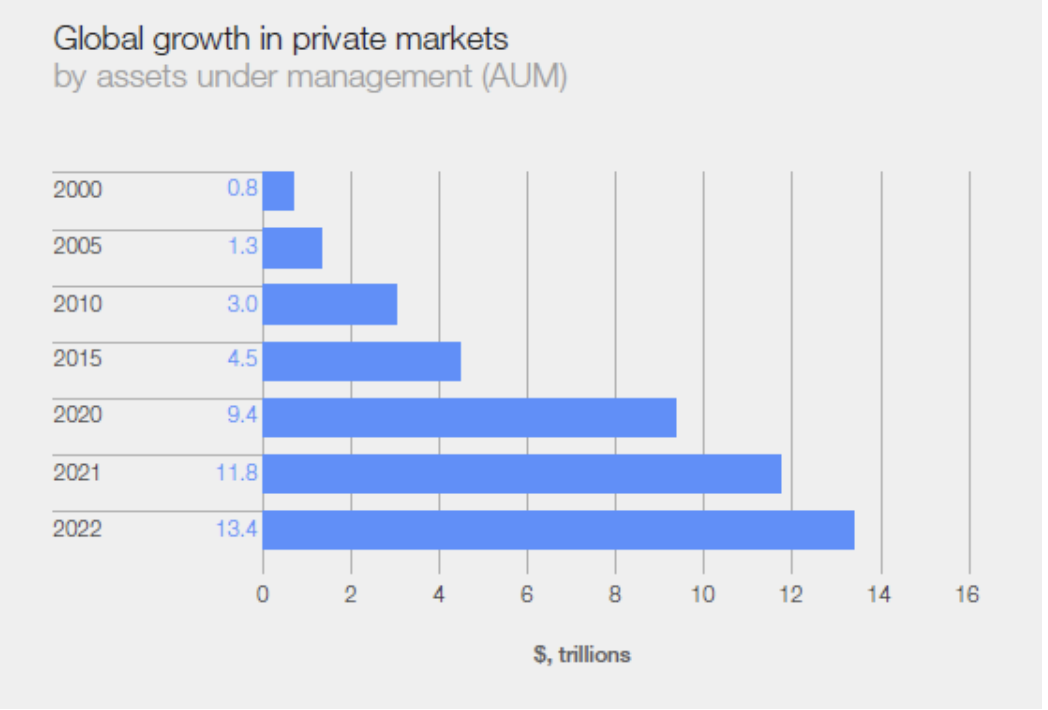 Chart 1: Global Growth in private markets, AUM, $ trillions.