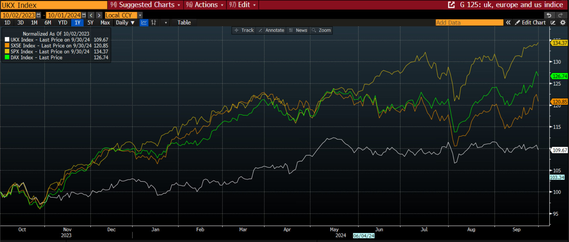 Chart 1: FTSE 100 vs. S&P 500 and Eurostoxx Index, normalized to show how they have moved together in the last 12 months.