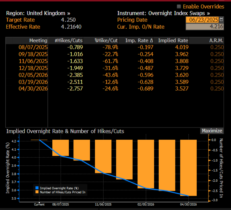 The Bank of England left the door open to another interest rate cut at their next meeting in August. The interest rate futures market is now pricing in a 79% chance of a cut, after more MPC members voted for a rate cut in June, and as the bank stressed the downside risks to growth as a bigger risk factor for the UK economy than inflation.