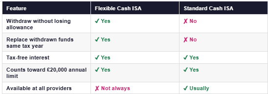 With a standard Cash ISA, every pound you put in counts toward your £20,000 annual allowance permanently. Withdraw £5,000 and then try to put it back, and you’ve used another £5,000 of your allowance. If you’ve already used your full £20,000, you simply can’t replace it.