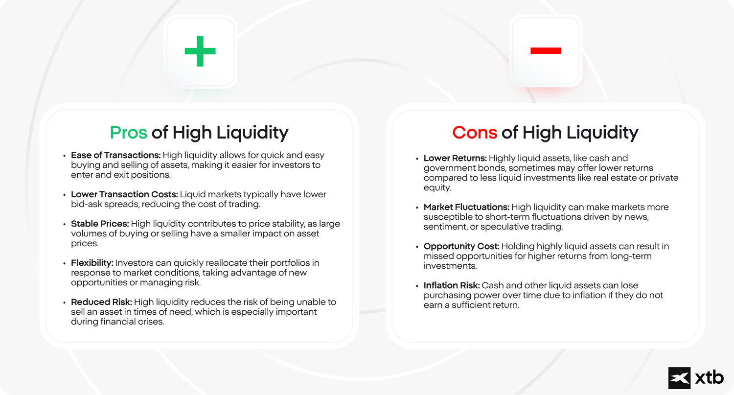 Liquidity is a fundamental concept in both financial markets and business operations. It ensures that assets can be quickly converted into cash without significant price impact, providing stability and flexibility for investors and businesses alike. While high liquidity offers several advantages, such as ease of transactions and lower costs, it also comes with certain drawbacks, including potentially lower returns and vulnerability to short-term market fluctuations. Understanding liquidity's role and managing it effectively is essential for achieving financial stability and success.