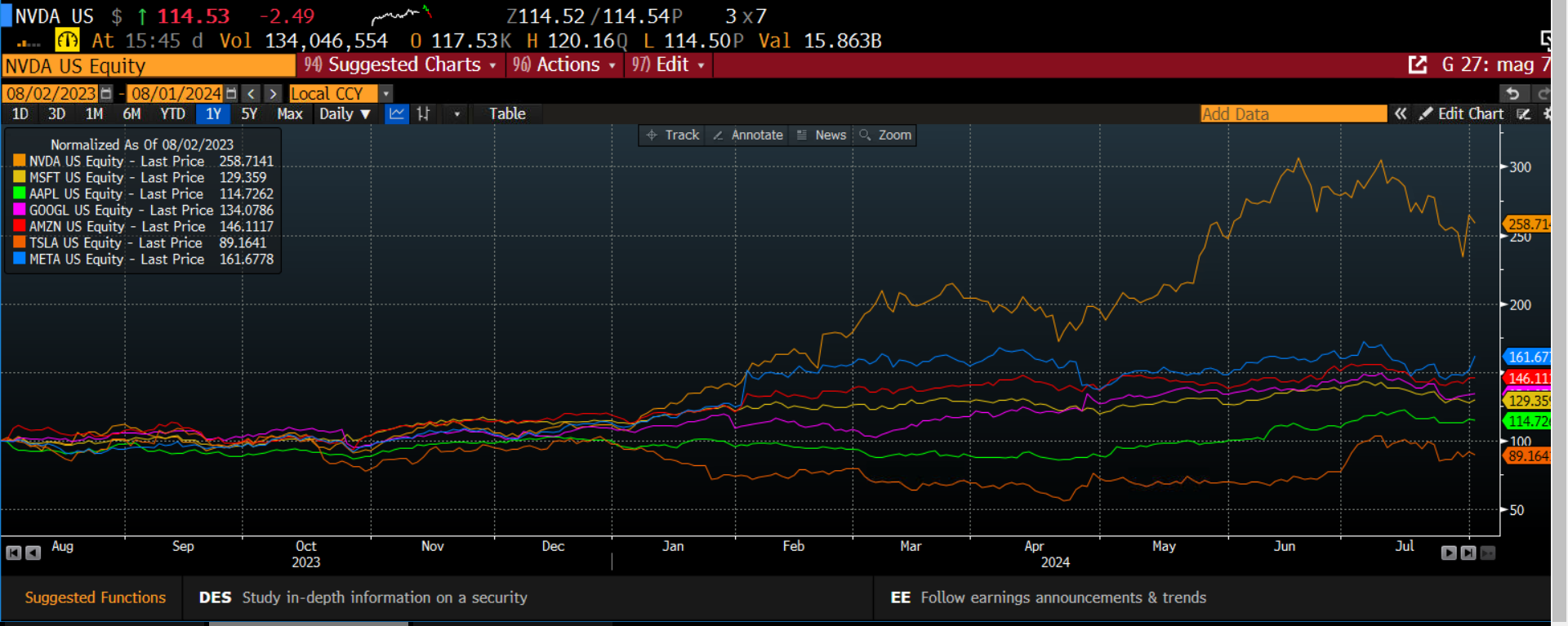 Within the world’s largest tech stocks, Nvidia is by some distance the best performer within the Magnificent 7 over the past 12 months, as you can see below.