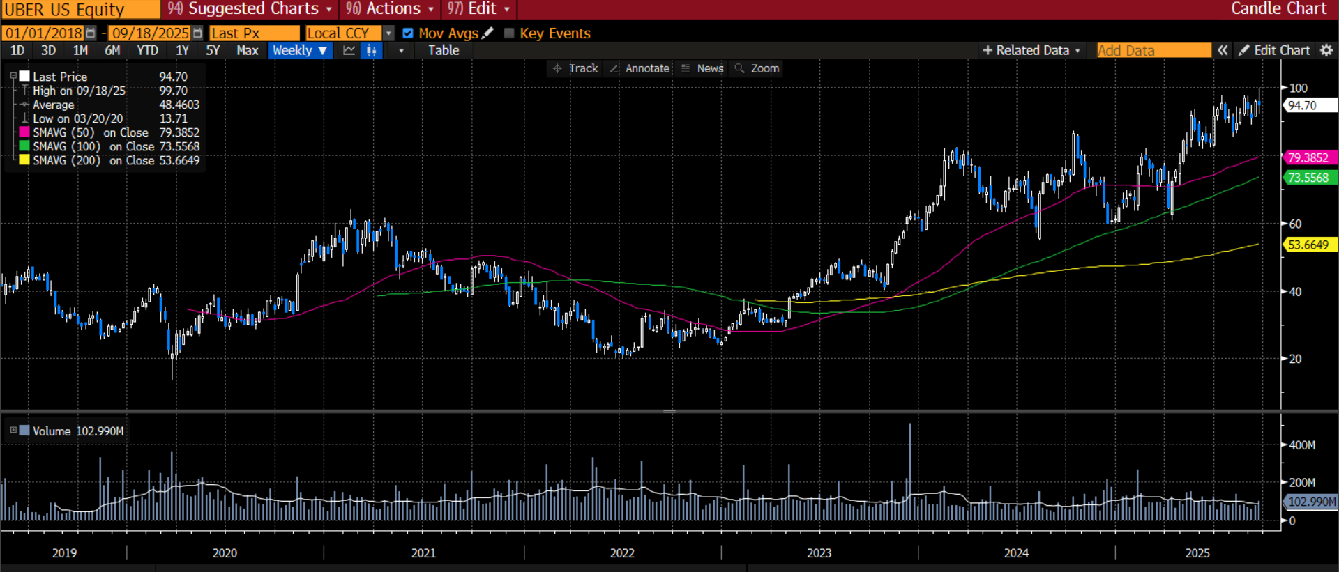 Chart 1: Uber’s share price hit a record on September 18, 2025