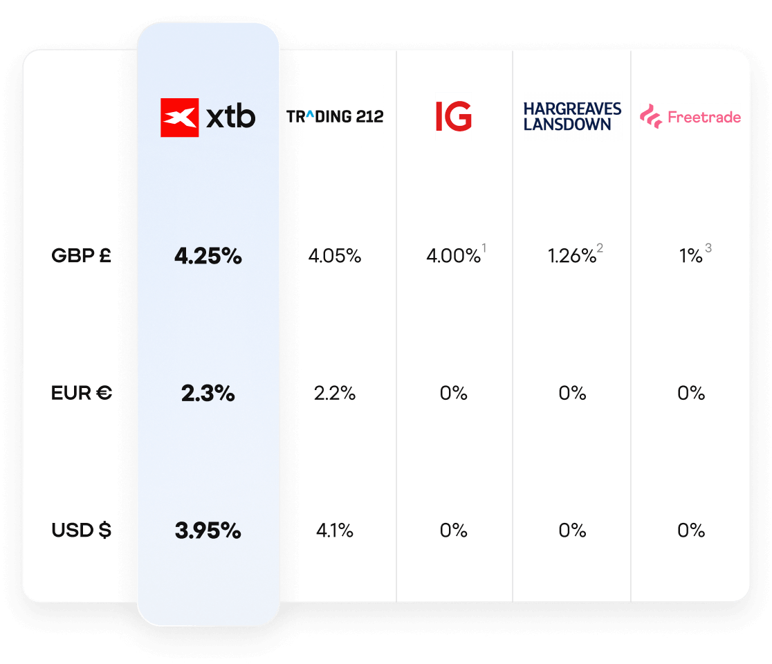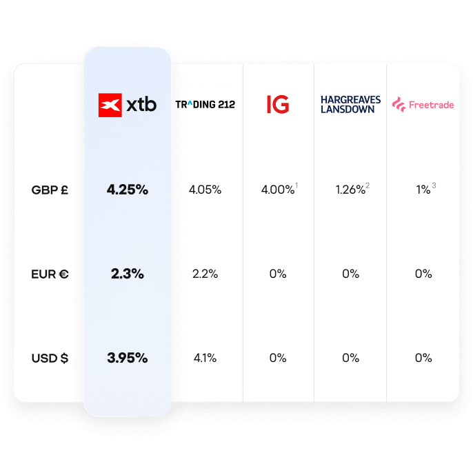 1. IG offers 4.25% on GBP uninvested funds limited up to £100,000 only and requires you to hold an open position or have traded every month.