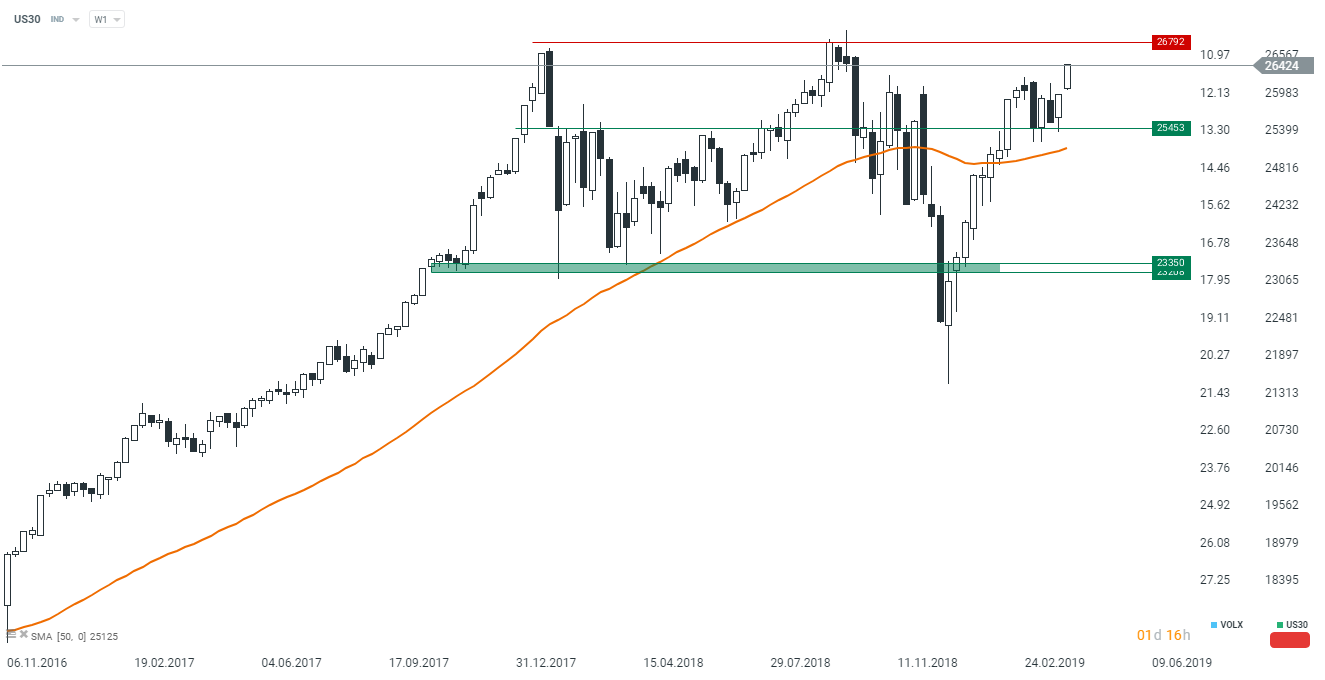 The Dow Jones (US30) keeps rising on the back of upbeat information coming from Washington. The all-time highs seem to be in sight. Source: xStation5