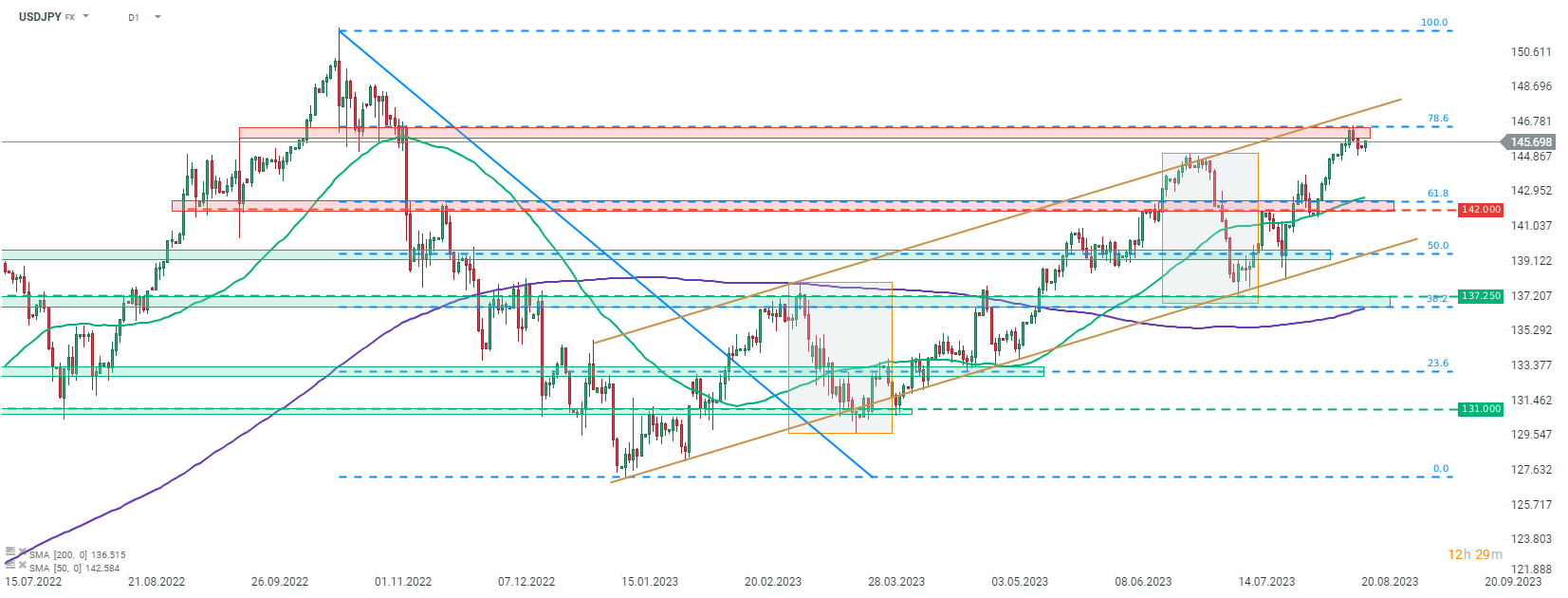 Having said that, today's weakening of Japanese yen is somewhat strange. Taking a look at USDJPY chart at D1 interval, we can see that the pair trading higher today, erasing almost all of the losses made on Friday. Another test of the resistance zone ranging below 78.6% retracement of the downward impulse launched in October 2022 cannot be ruled out. However, the upper limit of the bullish channel runs slightly above this resistance therefore bulls may struggle to extend gains even if they manage to break above the aforementioned 78.6% retracement.