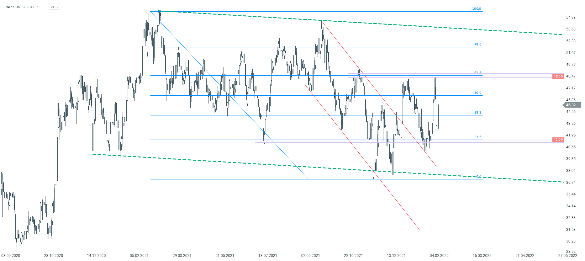 Airline shares are particularly vulnerable to negative global news. In 2020, a sell-off was triggered by news on the coronavirus and the suspension of flights. This year, investors feared a repeat of this situation as a result of the Omicron variant and the current escalation of tensions between NATO and Russia. In the meantime, however, some European economies are successively lifting the Covid restrictions. WizzAir's CEO said in an interview that he expects more countries to join in, to which the aviation market may react euphorically.