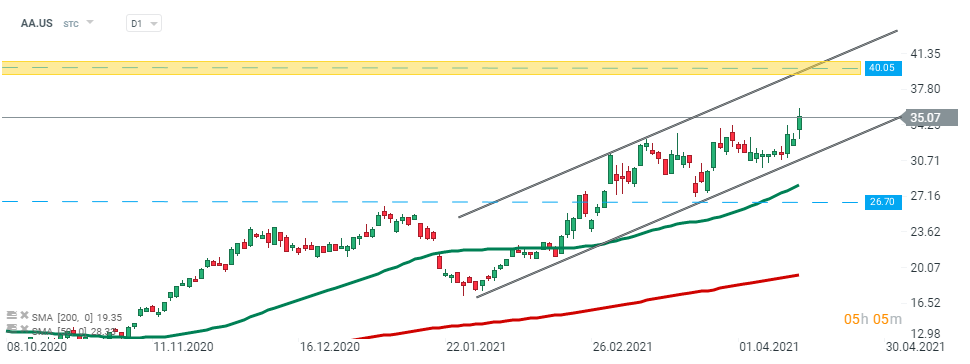 Alcoa (AA.US) stock rose sharpy following upbeat quarterly figures and is trading at the highest level since November 2018. If the current sentiment prevails then upward move may be extended to the resistance at $ 40.05 which coincides with the upper limit of the ascending channel. On the other hand, if sellers will manage to regain control and break below the lower limit of the channel, then downward impulse towards support at $27.50 could be launched. Source: xStation5