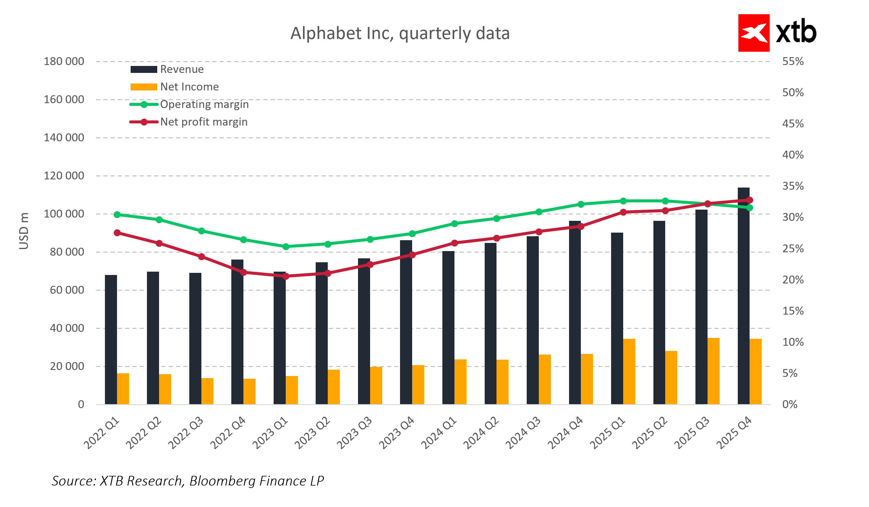 Alphabet released its fourth-quarter 2025 results, which clearly show that the company is accelerating in key areas of its business. Revenues reached a record $113.8 billion, marking a 14% increase year-over-year and surpassing market expectations of $111.4 billion. Earnings per share (EPS) came in at $2.82, above the forecast of $2.65, while net income reached $30.1 billion, representing a 20% year-over-year increase.