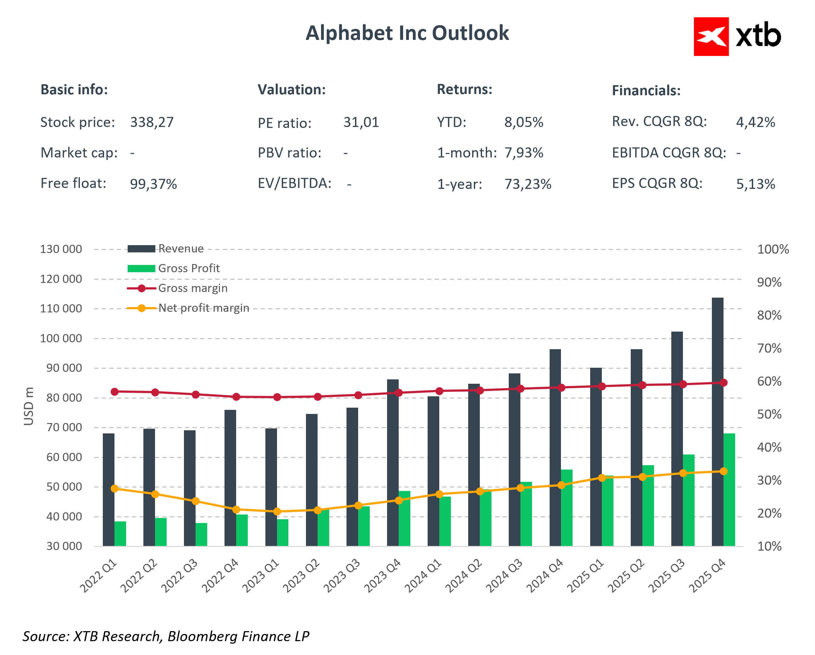 Alphabet demonstrates that it can effectively combine aggressive investment with profitable monetization. Steady growth in Google Services, dynamic expansion of Google Cloud, and controlled losses in Other Bets indicate a balance between expansion and profitability.