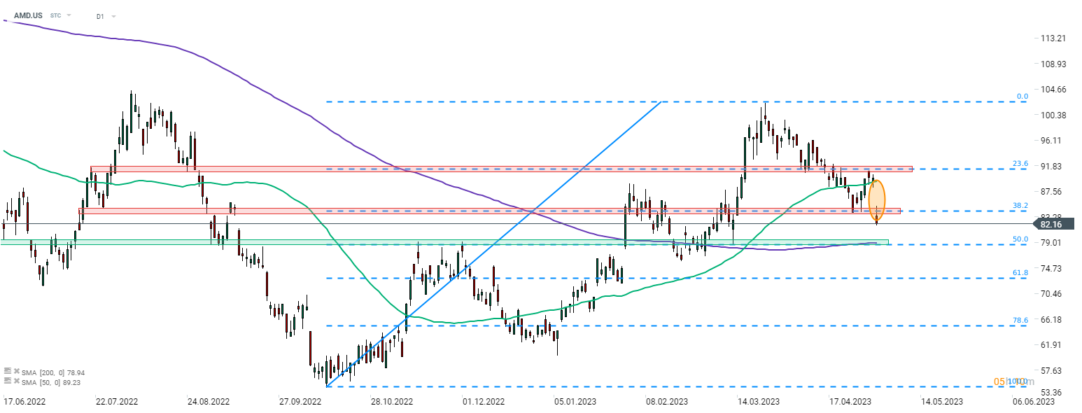 In spite of slightly better-than-expected results, AMD is trading around 9% lower today as Q2 2023 outlook disappointed. Stock launched today's trading with a big bearish price gap and is trading below price zone marked with 38.2% retracement of recent upward impulse. The next potential support zone to watch can be found in the $79.00 area, where 200-session moving average and 50% retracement can be found.