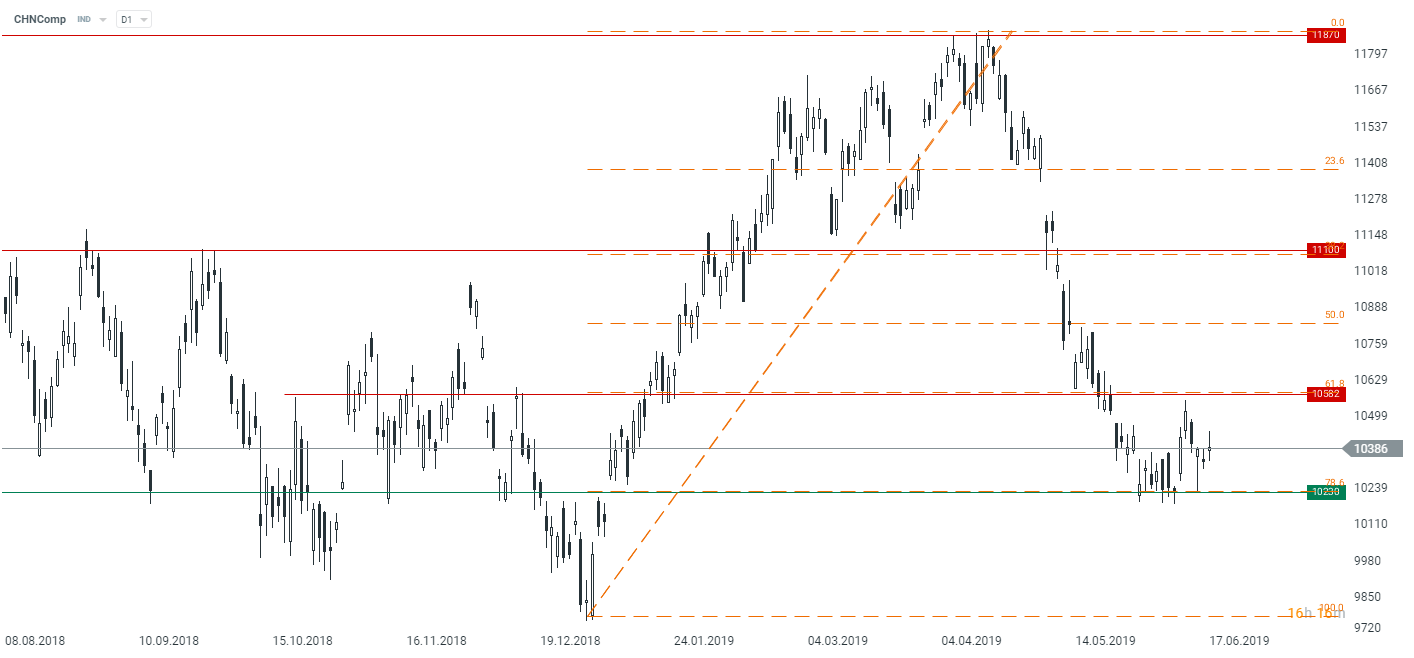 The Hang Seng (CHNComp) keeps trading between crucial technical levels as it failed to break below 10230 points. Thus, one may suppose that until the price remains within the consolidation, any larger moves are unlikely. Keep in mind that the Fed can set moods this week. Source: xStation5