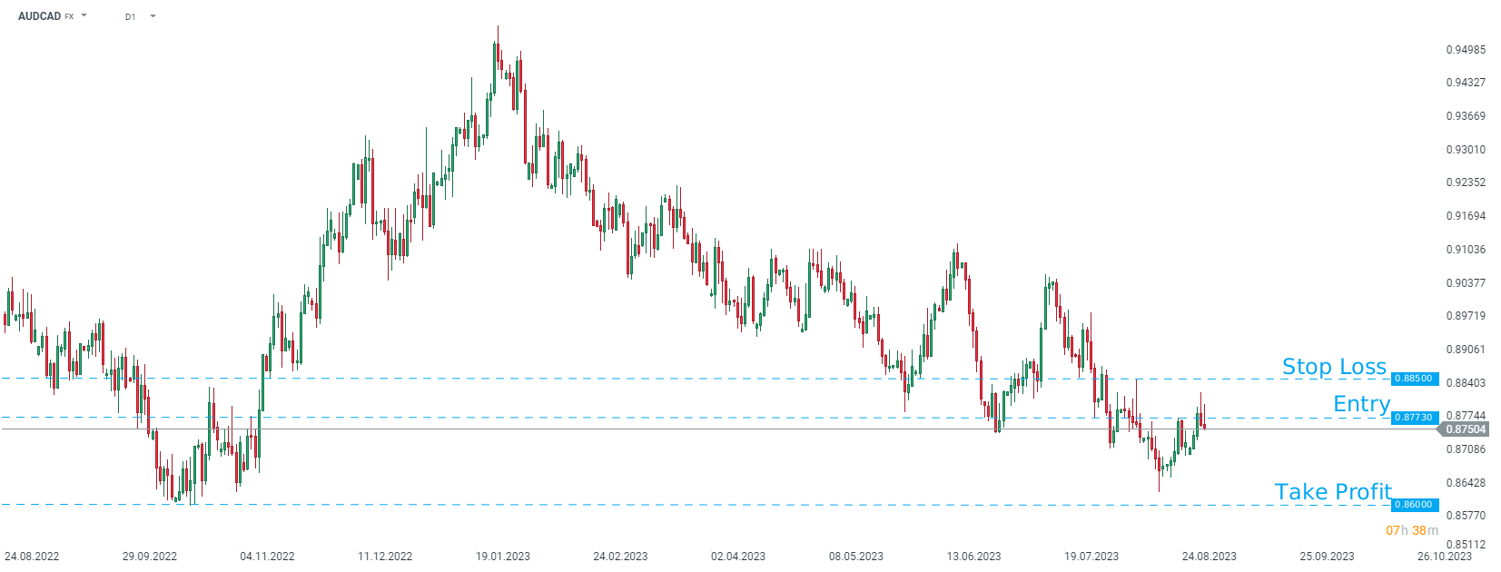 RBC recommends taking a short position on AUDCAD at market price with a target of 0.8600 and a stop loss order placed at 0.8850. Source: xStation5
