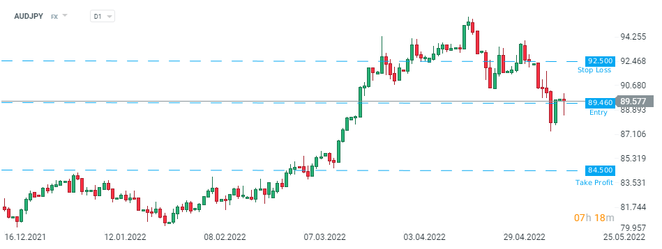 MUFG recommends taking a short position on AUDJPY at 89.46 with a target of 84.50 and a stop loss order placed at 92.50. Source: xStation5