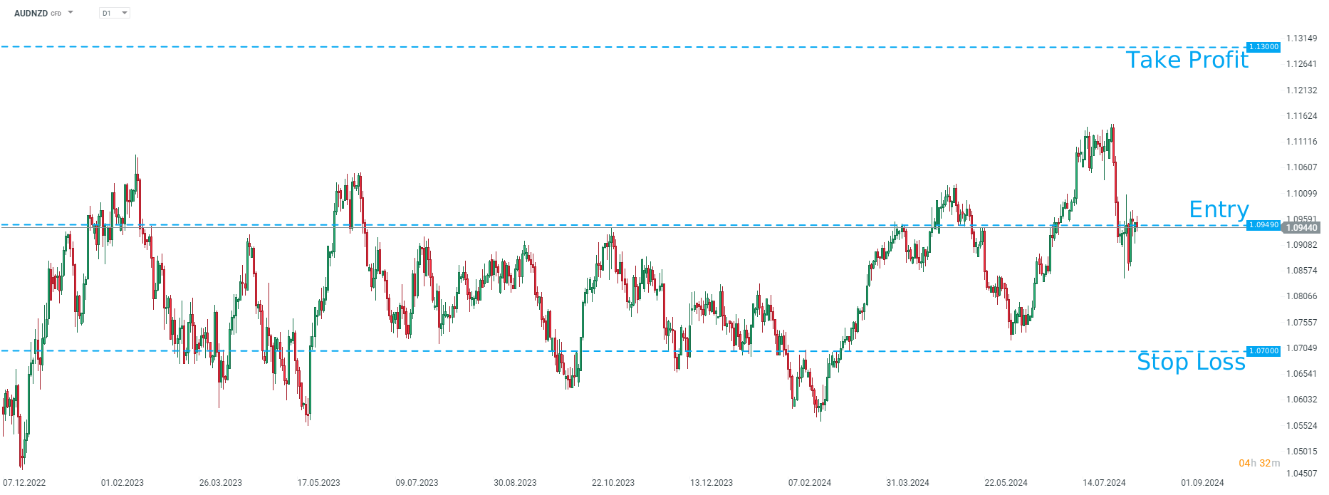 Bank of America recommends taking a long position on AUDNZD at market price with a target of 1.1300 and a stop loss order placed at 1.0700. Source: xStation5