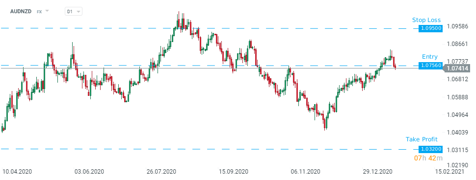 Nordea recommends taking a short position on AUDNZD at 1.0756 with a target of 1.0320 and a stop loss order placed at 1.0950. Source: xStation5