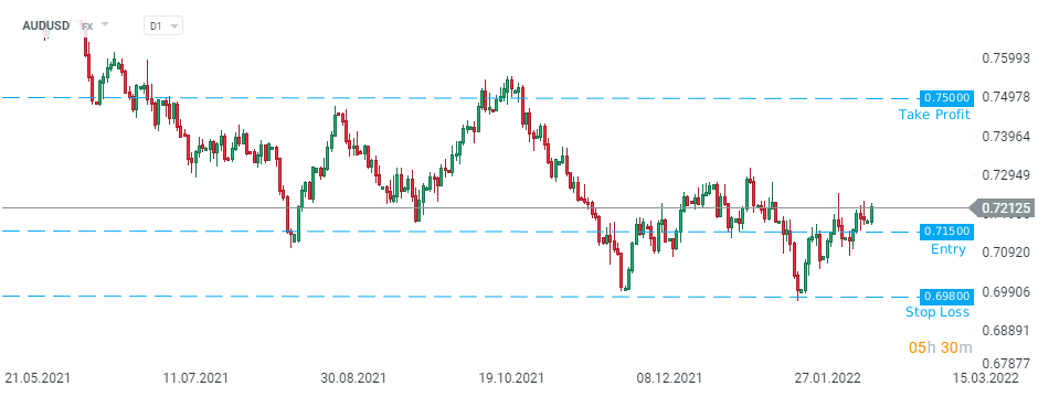 BNP Paribas recommends placing a limit order to long on AUDUSD at 0.7150 with a target of 0.7500 and a stop loss order placed at 0.6980. Source: xStation5