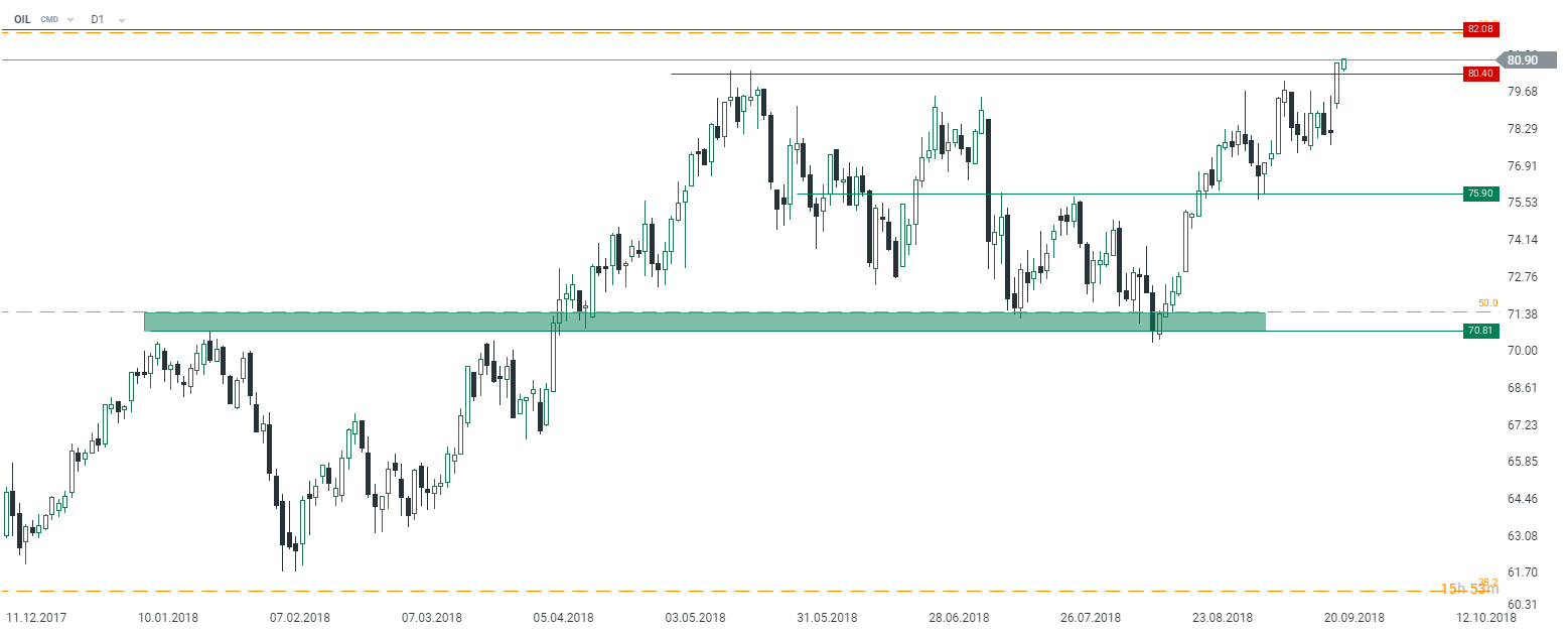 On top of that it is worth noting that five world powers - the UK, France, Germany, Russia and China - agreed on Monday to set up a special purpose vehicle in the European Union to facilitate payments for Iranian imports and exports after sanctions reimposed by the US on Iran will be enacted at the beginning of November. In a joint statement we could read that the special financial facility will “assist and reassure economic operators pursuing legitimate business with Iran”. Let’s recall that Donald Trump pulled out his country from the nuke agreement in May earlier this year accusing Tehran of promoting international terrorism. This special entity will allow the EU and Iran to do payments (including payments for oil) when US sanctions come into effect. Both grades of oil are trading roughly 0.4% higher as of 7:01 am BST.