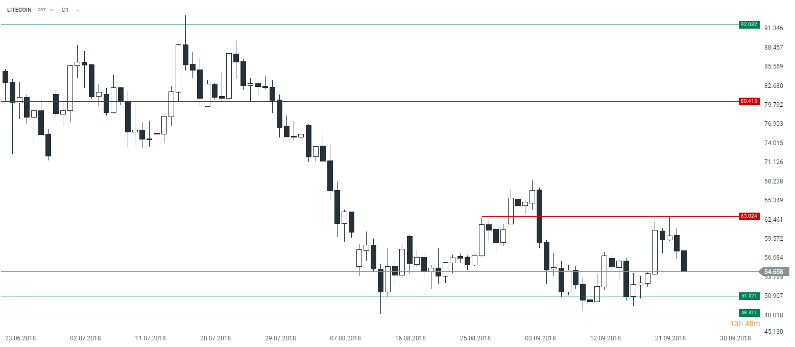 After touching $63 Litecoin has begun trimming its gains. As a result, one may count on a reversal even toward $51 followed by $48. Source: xStation5