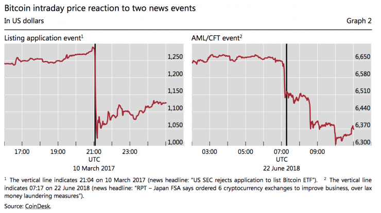 The organization also provided us with several examples of the Bitcoin price reaction to various events. The first one focused on the news from March 2017 that the US SEC had shot down a proposal from investors Cameron and Tyler Winklevoss to create what would have been the first US-based ETF for Bitcoin. After the news came out, the Bitcoin price plunged 16%. The second event concerned Japan where the Financial Services Agency (FSA) ordered six cryptocurrency exchanges to improve their money laundering procedures in June 2018. The question is why Bitcoin is reacting to regulation-related news? The BIS wrote that “cryptocurrencies rely on regulated institutions to convert regular currency into cryptocurrencies. Their cumbersome setup also means that many consumers hold and transact in cryptocurrencies through more interfaces, such as online crypto-wallets that are often regulated, or can be regulated in principle”.