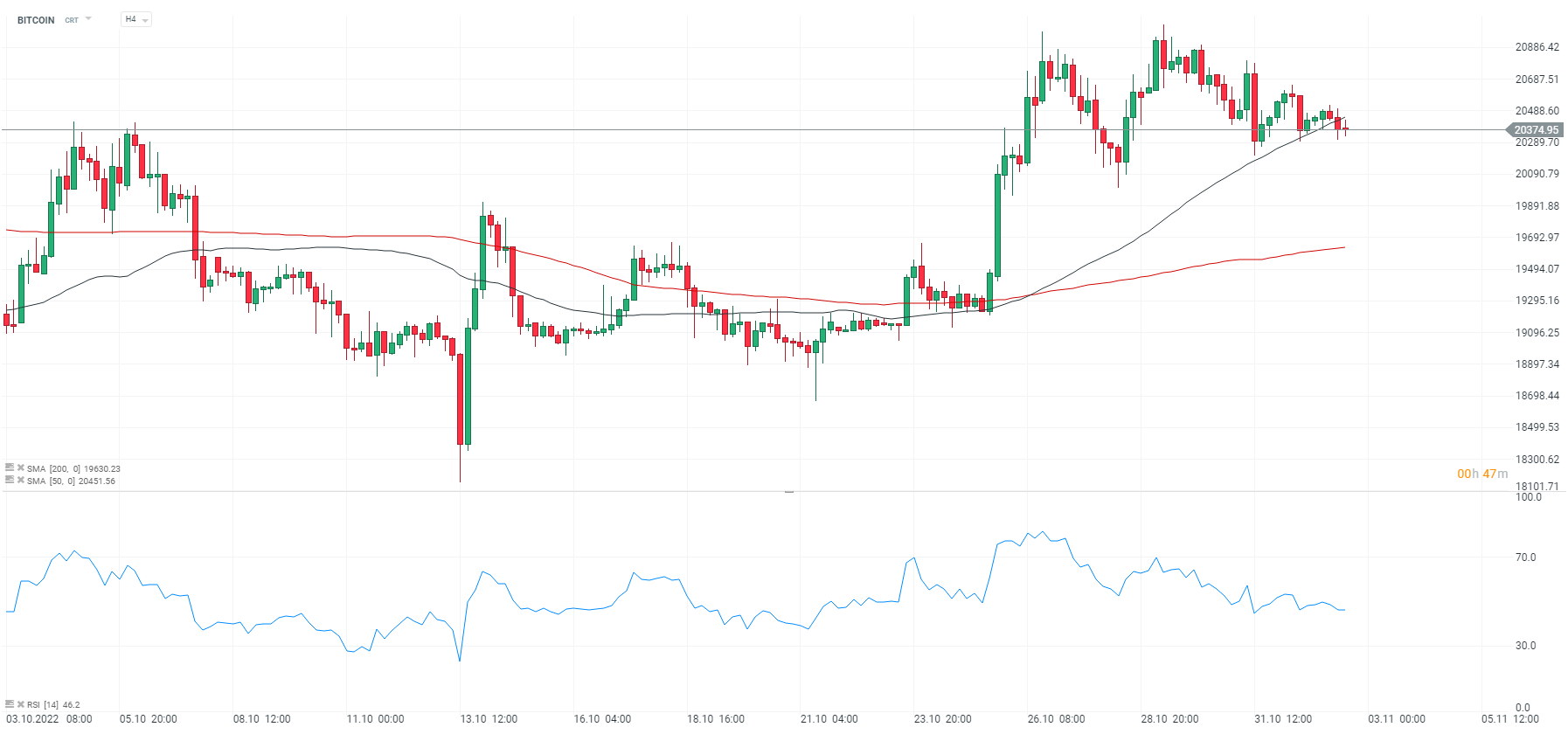 Bitcoin, H4 interval. Bitcoin showed some weakness as bullish rally calmes down. Bitcoin price is now below SMA50. Relative strenght index at 46 points could indicate volatility incoming. Source: xStation5