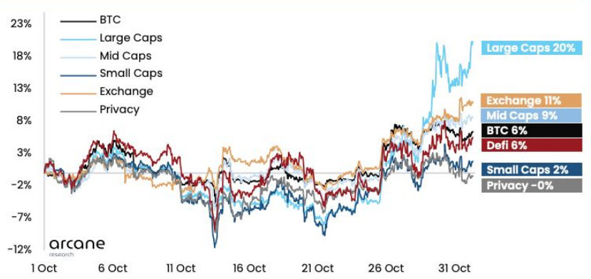 Until October 26, Bitcoin behaved better than almost all risk assets in October. At the end of the month, the largest and mid-cap stocks outperformed the king of cryptocurrencies. On the indices, the 'pivot' is more palpable, which is due to investors' still defensive moves and continued relative risk aversion. This manifests itself in the fact that perceived risky and volatile small-cap companies and cryptocurrencies continue to grow weaker than larger players. Source: Arcane Research