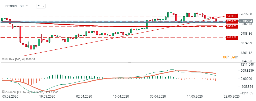 Bitcoin fell by 4% on Monday, violating the support of the 2.5-month-long bullish trendline. The breakdown is backed by a slightly deeper bars on the MACD histogram, a sign of strengthening bearish momentum. However if bulls will manage to take control, then the local resistance is located around $9,400. Source: xStation5