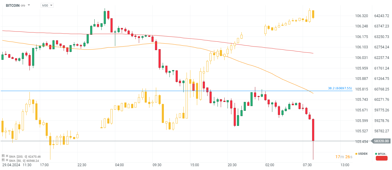 USDIDX is traded on the highest level since November 2023 and is rising constantly ahead of today FOMC. The history shows strengthening US dollar and 10-yr yields are pressuring more risky assets such as stocks and crypto.