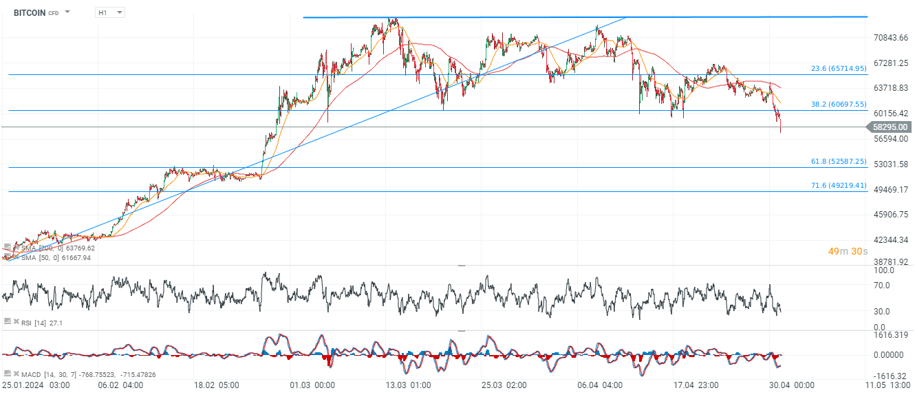 The biggest cryptocurrency extends downward correction today, with prices falling for a moment even $58.000 support zone. US dollar gains and USDIDX hits today the highest levels since November 2023 ahead of today FOMC decision (7 PM GMT) and Fed chair Powell speech (7:30 PM GMT). Bitcoin felt today to level unseen since the end of February 2024. What's important is that demand from US ETFs is still very weak (net outflows), and Hong Kong ETFs debut were disappointing. BTC price declined also below major on-chain support level at $59,500 where average short term holders 'realized price' is located. During previous Bitcoin bull runs, this on-chain zone were often very important support. At the same time,