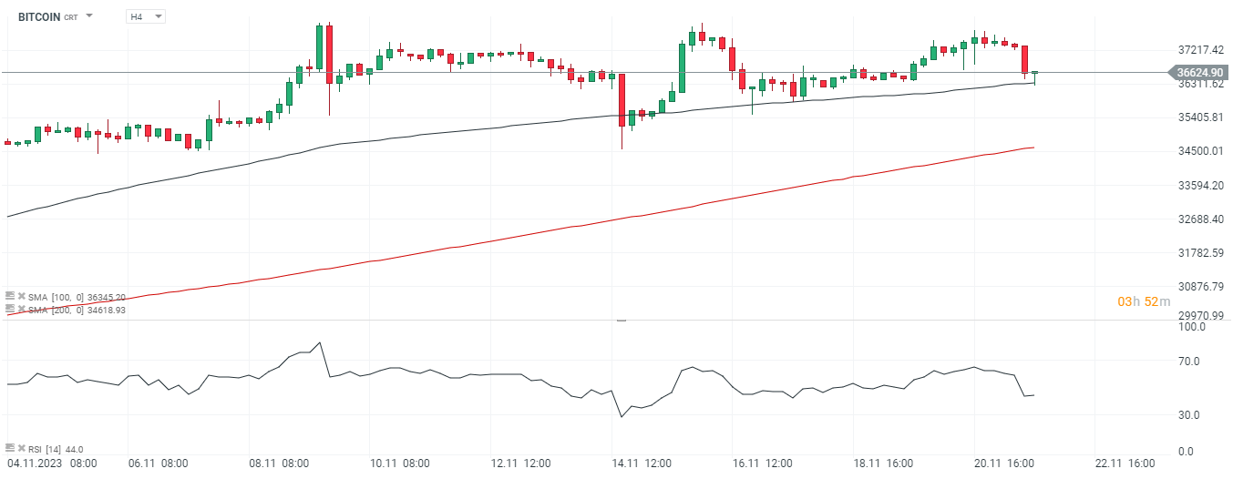 On the broader 4-hour interval, Bitcoin's price stopped at the 100-session average (SMA100, black). Source: xStation5