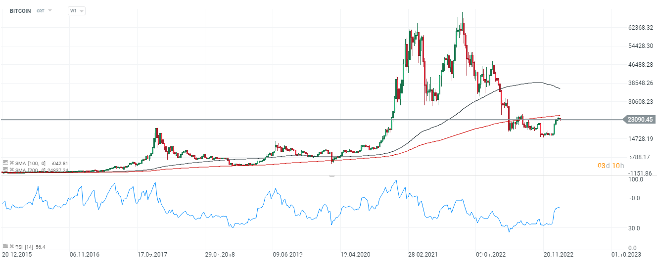 Bitcoin, W1 interval. The major cryptocurrency is still struggling to climb above the 200-week average, which has turned into resistance from its historic, very strong support in 2022. Source: xStation5