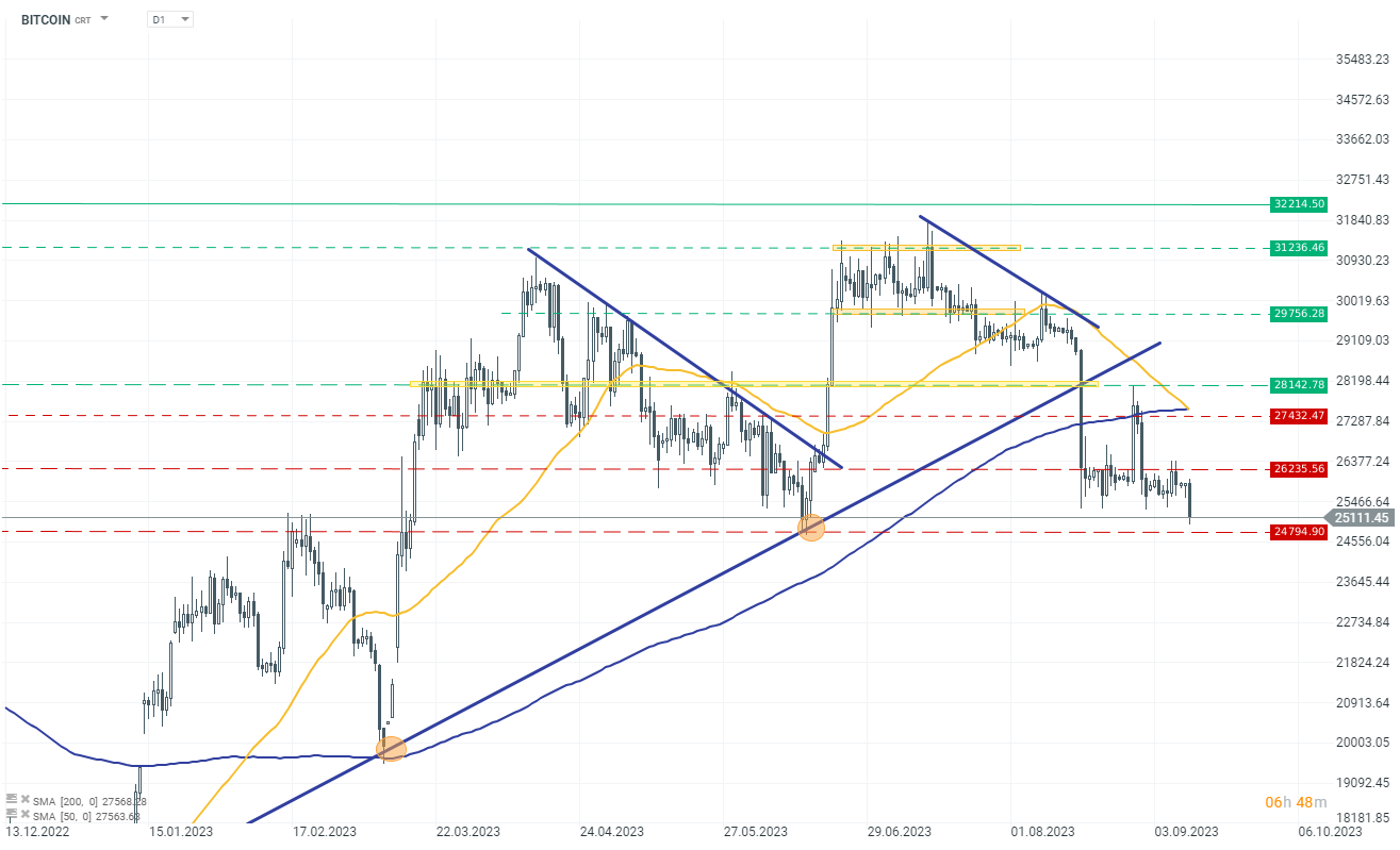 Bitcoin is down 2.70% and is struggling to maintain the key support zone at the level of 25,200 dollars. The sentiment in the market is not improving, and the upcoming decision on September 13th regarding the liquidation of FTX assets with a total value of 3.4 billion dollars is causing another wave of panic. The next level of support is 24,800 dollars. This was the low on June 15, 2023, following the market panic due to the delisting of many altcoins and SEC lawsuits.