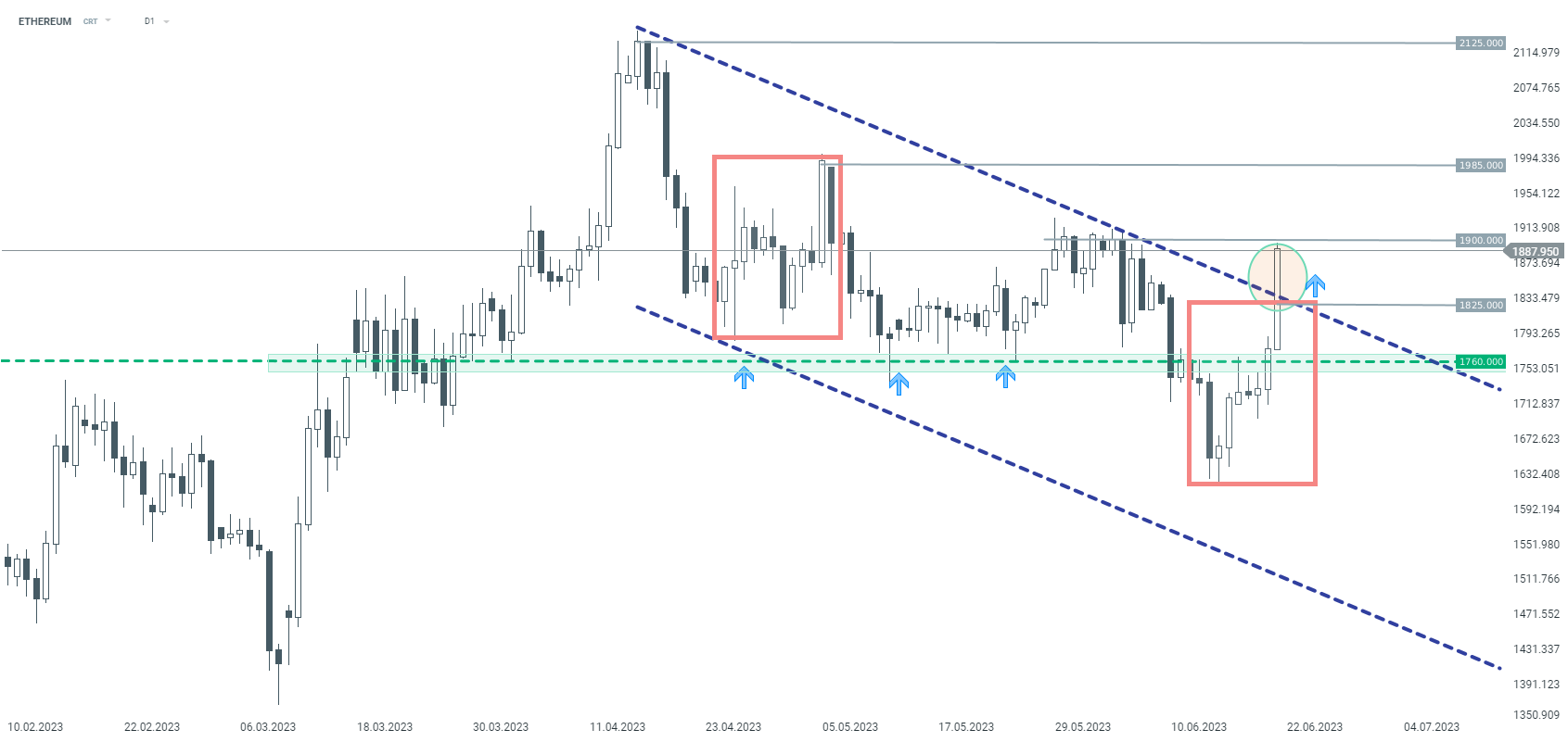Ethereum remains slightly behind Bitcoin, but the price has managed to surpass the 1:1 target level and break out above the descending channel, opening the way for further upward movement. After breaking the $1900 level, a move towards $1985 or even $2125 is not ruled out, D1 interval, source xStation 5.