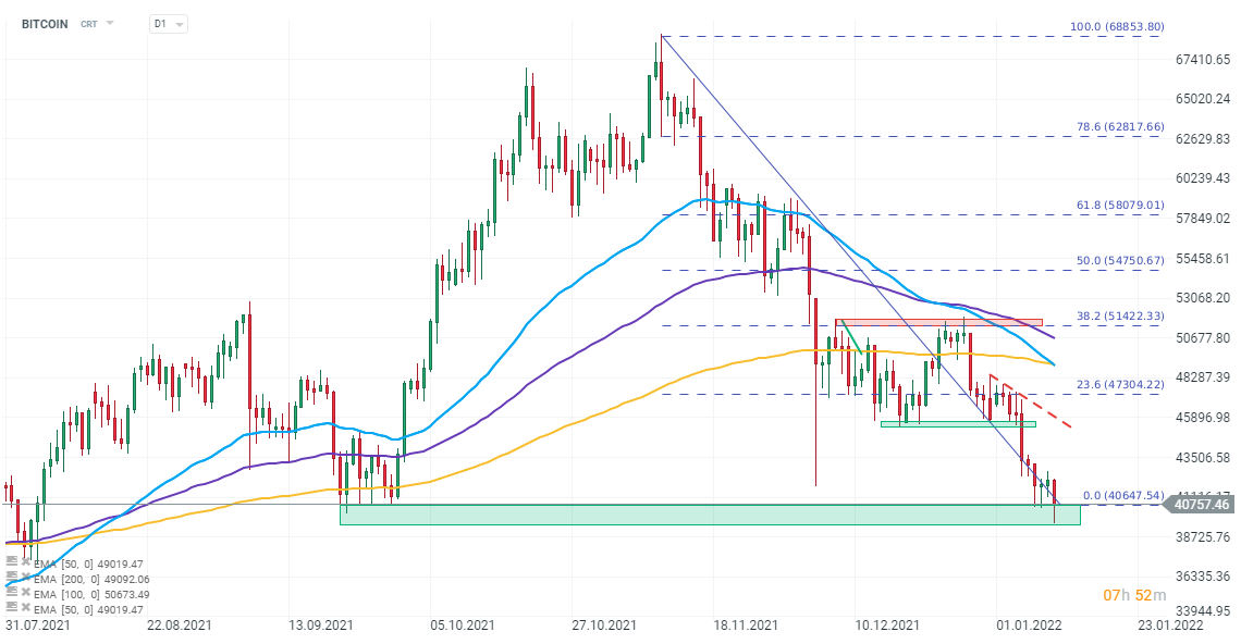 Bitcoin quotations fell below the psychological barrier of 40 000 USD at the opening of the session on Wall Street and reached the level of 39 500 USD. Currently, however, the buying side has managed to stop the declines and return above 40 000 USD. Today's declines are due to continued hawkish news and rallies in US Treasury bond yields, which weaken risky assets.