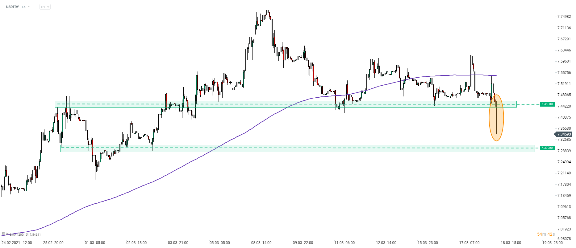 USDTRY slumps after CBRT delivered a bigger-than-expected rate hike. Source: xStation5
