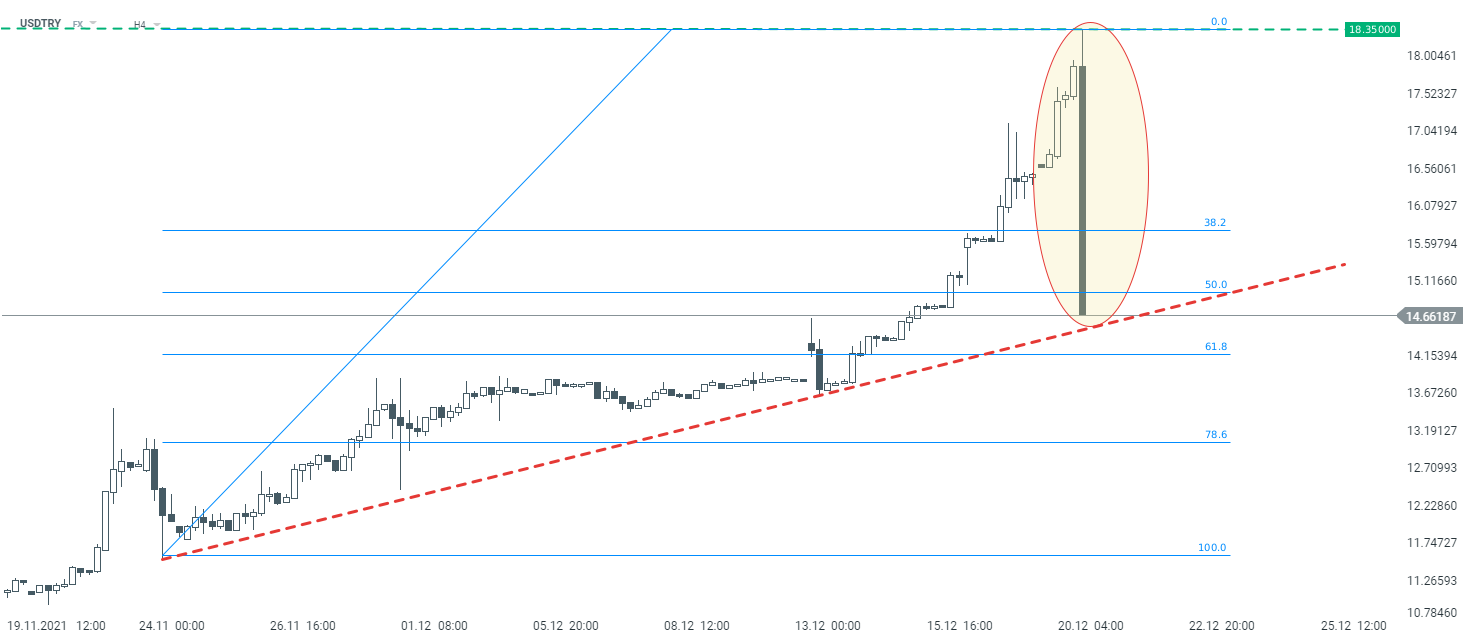 We can observe solid volatility on the Turkish lira during the last hour. TRY was declining at the beginning of the day, but now it is gaining dramatically. Looking at the pair USDTRY, we observe a 20% downward movement! So far, there is no information to explain such a large strengthening of the Turkish currency.