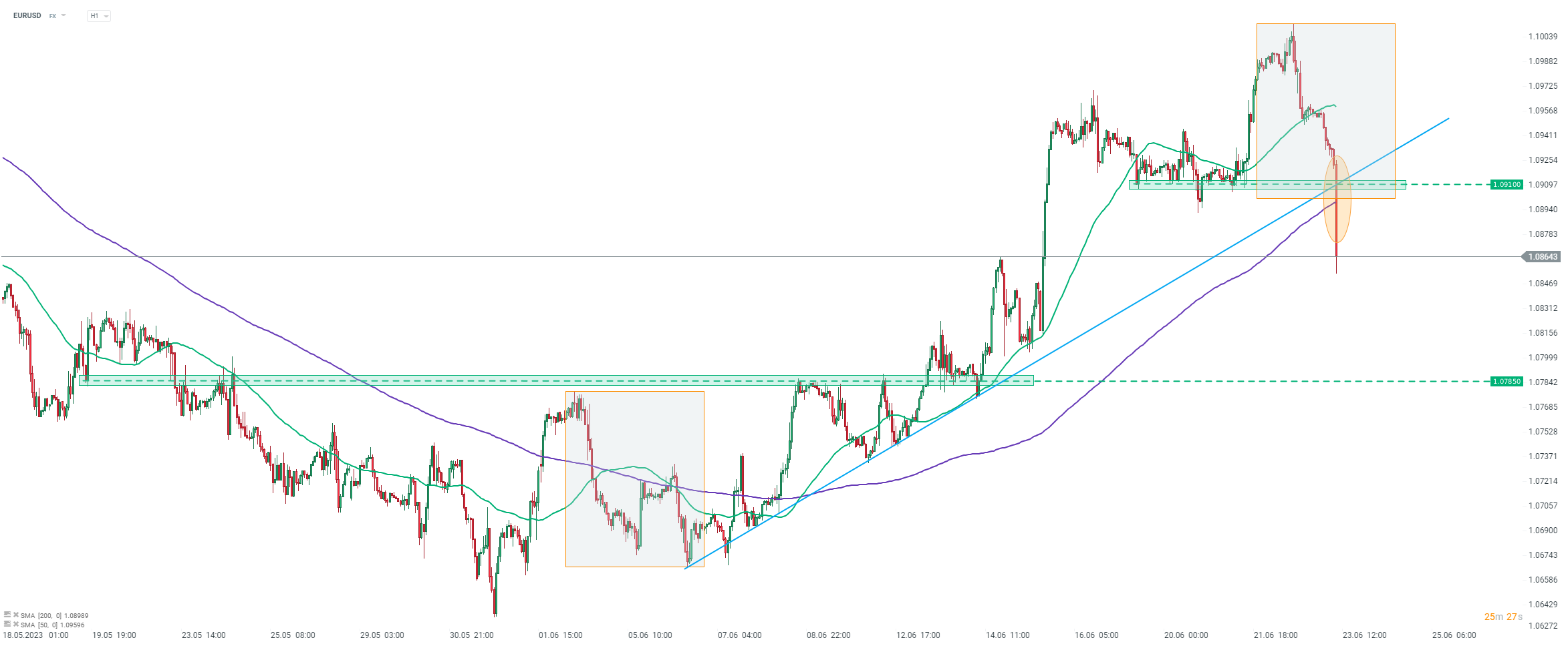 EURUSD plunged following flash PMIs for June from France and Germany. The pair broke through a number of technical supports in the process - 1.0910 support zone, upward trendline, lower limit of the Overbalance structure and 200-hour moving average (purple line). Source: xStation5